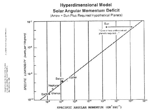 По иронии, объяснение очевидного отклонения Солнца от стандартной модели содержится в удивительном отклонении его кривой на нашем графике вращательного момента/светимости. В гиперпространственной модели первичный источник энергии Солнца, как и планет, должен зависеть от общего вращательного момента — собственного «спина» плюс общий вращательный момент планетарных масс на орбите. Как упоминалось выше, несмотря на то, что Солнце обладает 98% массы Солнечной системы, оно имеет всего 2% общего вращательного момента. Все остальное принадлежит планетам. Таким образом, если гиперпространственная модель верна, прибавляя момент их части к вращательному моменту Солнца, мы должны увидеть, что на графике Солнце должно следовать той же линии, что и планеты, от Земли до Нептуна. Однако это не так.