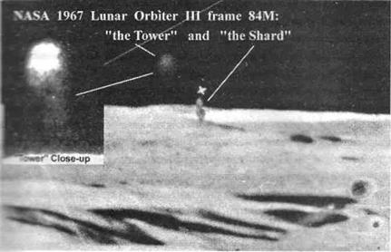 Эта «Башня», судя по всему, имела конусообразную поверхность и при этом на фото была наклонена к югу. Это явное отклонение от общей вертикали (схожее с внутренними частями в Фрагменте) могло напрямую быть связано с расстоянием между этим объектом и «Лунар Орбитером», проходившим в 30 милях над Луной и наблюдавшим ее поверхность. «Реальный объект», соединенный с поверхностью на самом деле вертикальной башней, несомненно, должен был выглядеть «наклонным», если: а) он находился ближе к космическому аппарату, чем «Фрагмент», б) находился в состоянии «медленного опрокидывания» в результате неумолимого воздействия постоянной метеоритной эрозии в течение миллионов лет.