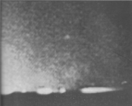 Однако снимки «Сервейора-6» отличались от всех других ранее анализировавшихся снимков НАСА одной весьма серьезной деталью: эти фото запечатлели таинственные геометрические структуры в рассеянном сзади свете (когда Солнце находилось почти за камерой). Снимок «Сервейора» с его сверкающими цепочками, протянувшимися вдоль западного горизонта и интенсивным рассеянием света над геометрической структурой, видимым над ней на фоне безвоздушного лунного неба, был сделан при встречном свете, из-за западной линии горизонта (рис. 4-11).
