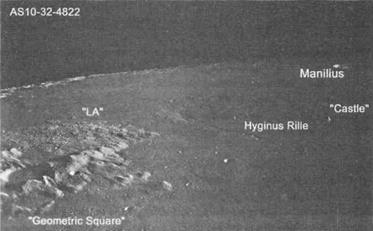 Рис 4-18. Вариант AS10-32-4822 с «Лос-Анджелесом» и «Замком» (на дальнем плане справа). Замок подвешен примерно в девяти милях над поверхностью Луны.