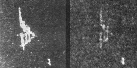 Стереоскопический анализ двух этих «вариантов» (рис. 4-19) подтвердил, что Замок находится в нескольких милях над поверхностью Луны — как будто, он просто «подвешен в пространстве». Как уже ранее отмечалось, вокруг него, вероятно, было множество намного меньших одинаково отражающих свет кусочков геометрических очертаний — будто бы фрагменты одной большой, когда-то бывшей единым целым, структуры, каким-то образом подвешенной над поверхностью.