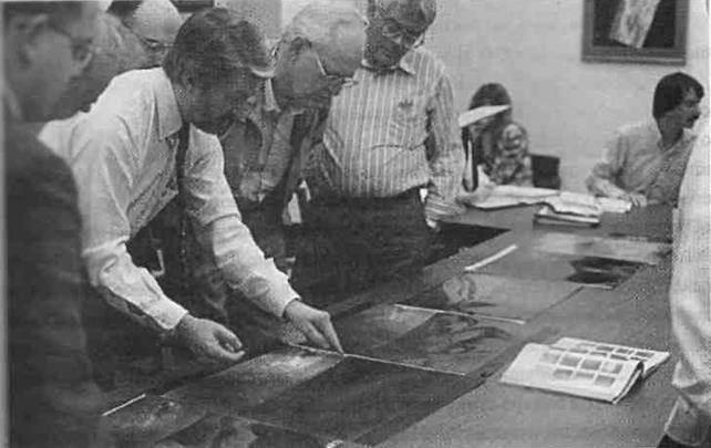 Рис. 4-22. Ричард С. Хогленд в 1995 году показывает руководителям Центра космических полетов НАСА им. Годдарда два фотографических увеличения снимка AS10-32-4822 — одно фото содержащее Замок, другое — не содержащее его. И задает главный вопрос: «Как на одном официальном снимке НАСА могут быть два разных набора данных?»