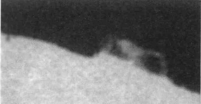 Когда космический аппарат проходил тысячи миль над большим горным бассейном» Восточного моря, навсегда уходя от Земли, он удачно сделал два снимка двух совершенно разных «аномальных лунных структур», которые прекрасно укладывались в разрабатываемую модель древнего купола в Срединном море. На первом снимке (рис. 4-24), опубликованном в журнале компании TRW «Формуляр Солнечной системы» в 1967 г., была запечатлена еще одна «башня высотой двадцать миль» (похожая на башню в Море Кризисов) — вертикально возвышающаяся над лунной поверхностью и расположенная где-то в районе западной оконечности Oceanus Procellarum (Океана Бурь). На втором снимке «Зонда-3», сделанном на тридцать четыре секунды позднее, «башни» не было, что говорило о том, что к этому времени она уже исчезла за горизонтом по причине движения и направления советского космического аппарата.
