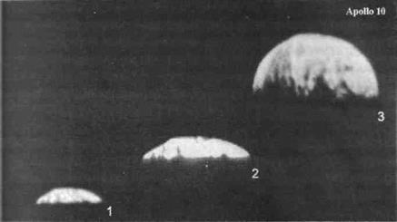 Рис. 4-36. Восход Земли с «Аполлона-10». Обратите внимание на сплющенные искаженные очертания земного шара, явление, совершенно невозможное на таких спутниках без атмосферы, как Луна.