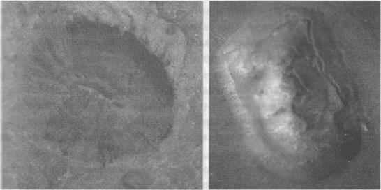 Рис. 8-1. «Человеческая» (слева) и «кошачья» (справа) половины «Лица на Марсе», сложенные по симметрии — по данным «Викинга», 1976. Открыты и представлены Хоглендом в ООН, 1992 (JPL/Хогленд).