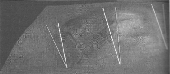 Рис. 8-4. Вариант снимка ЕОЗ-00824 НАСА, с сайта НАСА из статьи под названием «Cрывая маску с Лица на Марсе». Изображение перевернуто вниз головой и растянуто по горизонтали. Темные и светлые линии представляют степень отклонения от правильного ортогонального направления в трех ключевых точках на снимке (НАСА).