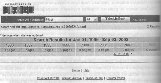 Кристенсен не знал о существовании сайта под названием «Интернет-архив» (archive.org). Благодаря финансовой поддержке Библиотеки Конгресса этот сайт был создан для фиксирования всех страниц, когда-либо существовавших в мировой Сети. Используя поисковое устройство «Wayback Machine», мы могли активизировать УУР дневного ИК-снимка Сидонии. В результате было обнаружено, что, несмотря на прошлые заявления Кристенсена в электронной переписке и его последние слова, информация на сайте ASU, созданная и отрегулированная «солдатом» Кристенсена Ноэлем Гореликом, была на самом деле вывешена 24 июля 2002 года, а потом была изменена ранним утром26 июля (рис. 10-7). Если вы помните, о чем мы рассказывали ранее, то Лейн скачал «настоящий» дневной ИК-снимок Сидонии поздно вечером (в 22.27) двадцать пятого числа. Иными словами, сразу после того, как Лейн это сделал, Горелик, Кристенсен или кто-то другой изменили содержимое сайта.