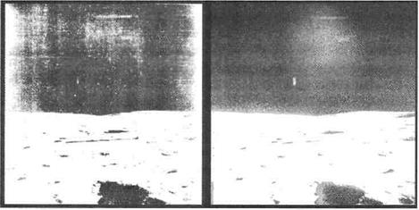 Рис. Е-1. Сравнение преобразованного телевизионного изображения с «Алоллона-11» (слева) и полароидные фото SSTV-мониторов, сделанные на станции слежения Паркере в Австралии (справа).