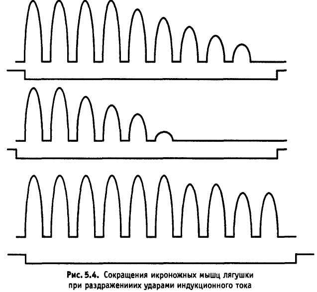 Научившись уверенно читать физиологические кривые, Вы сможете извлекать из них весьма обширную информацию. Рассмотрим рис. 5.4. На нем приведена запись сокращений трех икроножных мышц лягушек при раздражении ударами индукционного тока. Полученные записи говорят о следующем.