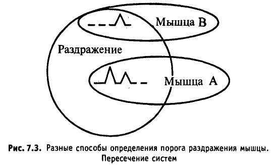 Теперь перейдем к решению. По условию даны два различных способа определения порога раздражения. Обозначим их соответственно А) и В). Известны различия в воздействиях, требуется определить различия в получаемых результатах. Поэтому применим прямое правило АРР-ВС. Вариант 1-2. Действительно, воздействующая система одна и та же – «электрическое раздражение». А объект воздействия разный. В одном случае – мышца, которая постоянно сокращалась, пока мы не дошли до порога раздражения. В другом – мышца, которая ни разу не сократилась до этого момента. Изобразим пересечение систем (рис. 7.3). Различия между узлами пересечения связаны с разным состоянием элемента «свойства мышцы». Остается определить, как эти различия скажутся на результатах. Очевидно, что в ситуации А) состояние мышцы до момента определения порога все время изменялось, так как мышца каждый раз сокращалась. В ситуации В) этого не происходило. Поэтому в последнем случае результаты будут более точными, что и учитывают на практике, когда при определении порога раздражения всегда идут «снизу» – от более слабых, подпороговых раздражений, постепенно повышая их силу.