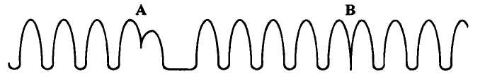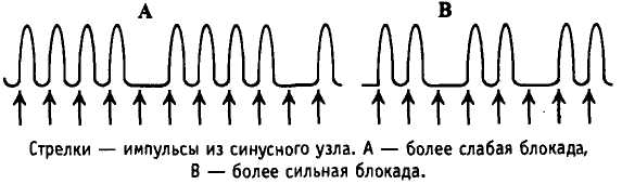 685. При поперечной блокаде сердца после нескольких сокращений предсердий очередное сокращение желудочков выпадает. Чем сильнее выражен; блокада, тем чаще происходят такие выпадения: