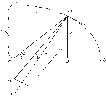 може бути побудована геометрично. Візьмемо відрізок прямої, рівний великій півосі еліпсоїда, і відкладемо його так, щоб один кінець відрізка лежав на поверхні еліпсоїда в деякій точці Q , а другий – на осі обертання еліпсоїда в точці Q’ (рис 2.3)