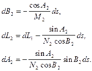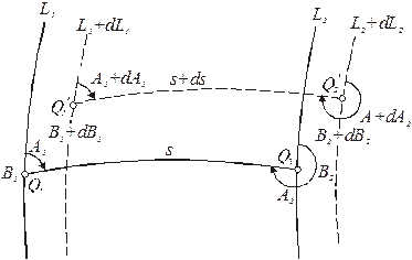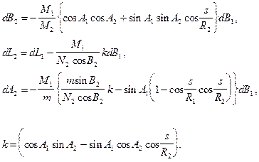 · зміни азимута A1 на величини B2, L2, A2 при постійній величині широти B1, довготи L1 тадовжини геодезичної лінії s