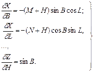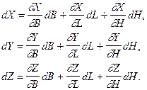 Встановимо залежності між малими змінами просторових декартових і геодезичних координат довільної точки в просторі. В загальному вигляді ці залежності можна записати