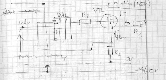 Якщо Uвх починає збільшуватися VT1 відкривається і струм через навантаження зростає, але завжди буде виконуватися: