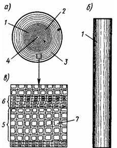 3 — заболонь; 4 — серцевина; 5 — ранні річні шари; 6 — пізні річні шари; 7 — клітки – трахеїди.