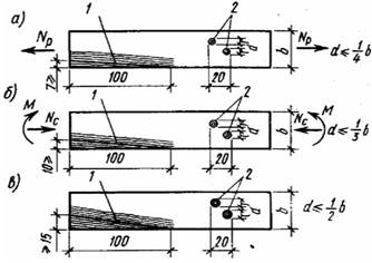 У деревині середньої міцності 2-го сорту допускається відносно більша загальна ширина сучків d<l/з b і нахил волокон не більше 10% до осі. У найменш міцній деревині 3-го сорту допускаються сучки ще більшої ширини —d<1/2b і нахил волокон не більшt 12 % (рис. 1.3).