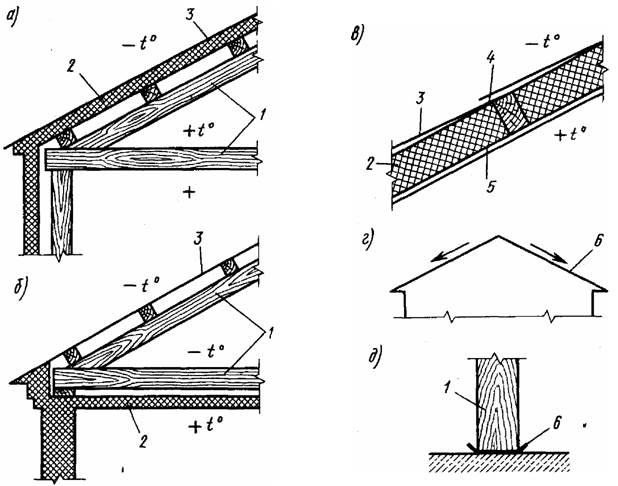 Рис. 1.6. Конструктивний захист від гниття: а — безгорищне утеплене покриття; б — горищне утеплене перекриття;