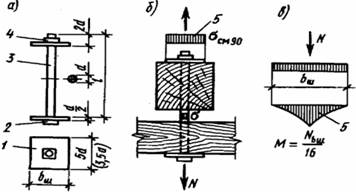 Деревина під шайбами болта повинна бути перевірена на міцність при місцевому зминанні по формулі (2.15). По цій же формулі можна підібрати розміри сторін шайби: Ан = N/(Rзм90·0,8). Розрахунковий опір деревини місцевому зминанню під шайбами, з огляду на підтримуючу дію деревини, що оточує шайбу, приймаєтьсяRзм90 = 4 МПа. Шайби розтягнутих болтів працюють і розраховуються на згин від реактивного тиску деревини, що зминається, як квадратні пластинки шириною b, обперті в центрі на гайки болтів. При цьому найбільший згинальний момент М в середньому перерізі шайби, ослабленому отвором діаметром d і необхідну товщину шайби δн можна приблизно визначити з виразу: M=Nb/16; Wн = M/R;