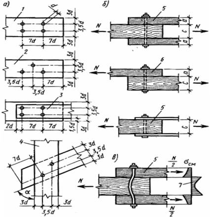 3 — при металевих накладках; 4 — в з'єднаннях під кутом; 5-симетричне ; 6 — несиметричне ; 7 — епюра напруг зминання деревини