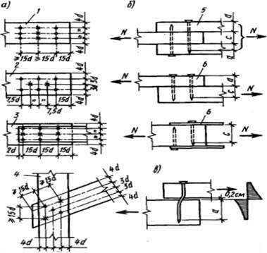1,2 — пряме і шахове розміщення; 3-в сталевих накладках; 4 — у з’єднаннях під кутом; 5 — симетричне двозрізне; б — несиметричне однозрізе
