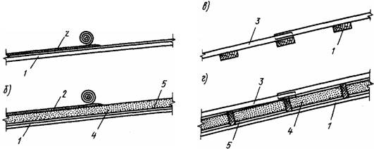 г — те ж, утеплене; 1 — настил; 2 — рулонна покрівля; 3 — азбестоцементна покрівля; 4 — утеплювач; 5 — пароізоляція.