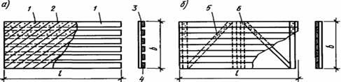 Рис. 4.2. Дощато-цвяхові щити настилів покриттів: а — щит подвійного перехресного настилу; б — щит одношарового разкісного настилу;