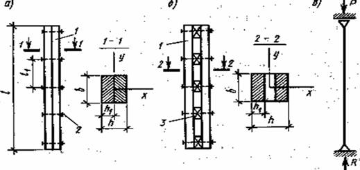 Рис. 5.6 Складені брущаті стійки: а-суцільна; б-наскрізна з прокладками; в.-схема роботи;. 1-бруси; 2 -болти; 3 -прокладки