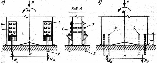Розрахунок жорстких кріплень стійки до фундаменту виконується на дію максимальної сили, що розтягує, Nр. Вона виникає від дії максимального згинаючого моменту в опорному перерізі Мд і визначається з урахуванням подовжньої сили Nр по формулі Nр=Мд/е - N/2. Тут е = h - h0 — плече пари внутрішніх сил.