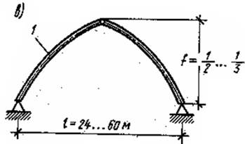Сегментні клеєдерев’янні арки з клеєних елементів заводського виготовлення без затяжок (рис. 6.1,а, поз. 1) мають значну висоту, яка досягає половини довжини їхнього прольоту, спираються, як правило, безпосередньо на фундаменти і застосовуються в покриттях громадських однопролітних будівель без стін. Невисокі сегментні клеєдерев’яні арки без затяжок, що мають висоту, рівну біля 1/6 довжини прольоту, використовують переважно в покриттях середнього найбільшого прольоту трьохпролітних громадських будівель. Вони спираються на елементи несущого каркаса бічних прольотів, що сприймають їхній вертикальний і горизонтальний опорні тиски.