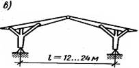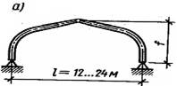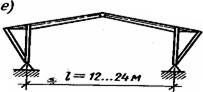 Рис. 7.3. Двухшарнірні клеєдерев’яні рами: . а- з жорсткими опорами й аркою; б-із жорсткими опорами і фермою;