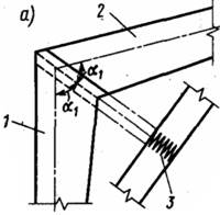 Конькові вузли цих рам можуть виконуватися аналогічно коньковим вузлам трьохшарнірних арок із застосуванням сталевих кріплень чи двосторонніх клеєдеревяних накладок і болтів. Карнизні стики ломаноклеєних рам вирішені з застосуванням зубчастих шипів, іноді з використанням вставок з деревяного пластика підвищеної міцності (рис. 7.5).
