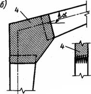Рис. 7.5. Карнизні стики ломаноклеєних рам: а — із зубчатим шипом; б — із вставкою з деревяного пластику;