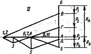 / - схеми і навантаження; //. – діаграми зусиль Максвелла – Кремона.