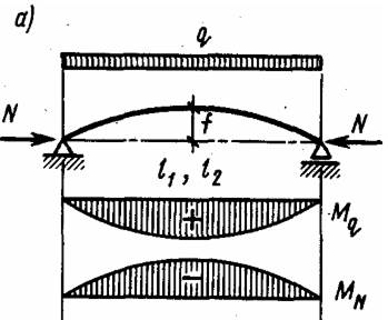 Статичний розрахунок полягає у визначенні зусиль, що діють у стержнях ферми від усіх розрахункових навантажень і їхніх сполучень. Поздовжні сили N визначаються у всіх стержнях ферми. Для цього розподілені навантаження, що діють у верхньому поясі, умовно вважають зосередженими в його вузлах. Гнуті осі стержнів верхнього поясу сегментної ферми умовно заміняють їх хордами. Потім визначають поздовжні сили методами побудови діаграми зусиль Максвелла-Кремона, вирізання вузлів або методом перерізів. Приклади побудови діаграми зусиль показані на рис. 8.6. Згинаючі моменти виникають тільки в перерізах верхніх поясів при наявності на них міжвузлового навантаження. Їх визначають у такий спосіб. Стержні де l - горизонтальна проекція прямого стержня або хорди гнутого; е=(h - hо)/2 — эксцентриситет подовжніх сил у прямому стержні з висотою перерізу h і в кінцях його ho; f = l2 / 8r - стріла вигину гнутого стержня. верхнього поясу розглядають як елементи, шарнірно вперті у вузли, на які діє міжвузлове, наприклад рівномірно розподілене навантаження і поздовжні стискаючі сили, визначені раніше. Cили N діють уздовж розрахункових осей прямих стержнів чи вздовж хорд гнутих стержнів верхнього поясу (рис. 8.7). При рівномірно розподіленому навантаженні q ці згинаючі моменти в прямих Мпр і гнутих Мгстержнях визначають по формулах