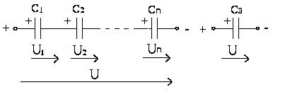 При последовательном соединении конденсаторов (рис.1.12) общее напряжение на зажимах цепи равно сумме напряжений на участках цепи: