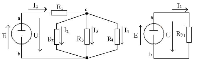 На рис.1.15 представлена электрическая цепь со смешанным соединением резистивных элементов, которую можно преобразовать в эквивалентную схему замещения.