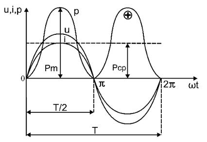 p - пульсирующая величина, колеблющаяся от 0 до 2UI с частотой в 2 раза больше частоты переменного тока. Мгновенная мощность всегда положительна.