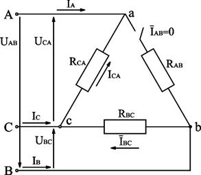 Рис.3.20. Электрическая схема трёхфазной системы, соединённой треугольником, с отключенной фазой