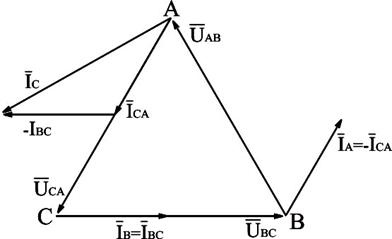 На рис.3.21 приведена векторная диаграмма напряжений и токов при обрыве фазы аb нагрузки, соединённой треугольником.