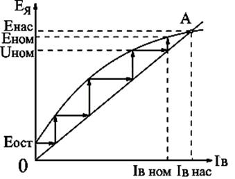 Условием самовозбуждения генератора является наличие слабого магнитного поля. Процесс самовозбуждения показан на характеристике холостого хода (рис.5.8). При токе возбуждения