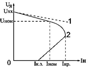приведена на рис.5.9 и распологается ниже внешней характеристики 1 генератора независимого возбуждения. При изменении тока нагрузки генератора от 0 до критического значения Iкр происходит насыщение генератора и характеристика носит устойчивый характер. При достижении значения Iкр характеристика падает до значения Iк.з.<Iном.