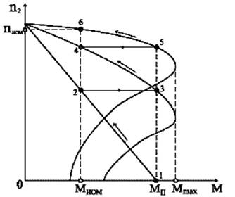 Пуск двигателя начинается с точки 1 с пусковым моментом Мп и происходит по характеристике 1 – 2 при полностью введённом сопротивлении реостата. Как