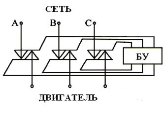 Симисторы включаются в каждую фазу сетевого напряжения и используют положительный и отрицательный полупериоды переменного тока. Открытие симисторов осуществляется с блока управления БУ путем подачи электрических