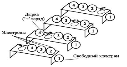 На рис.7.3 изображена схема образования свободного электрона, а так же перемещения электронов и заполнения дырок в кристалле германия.