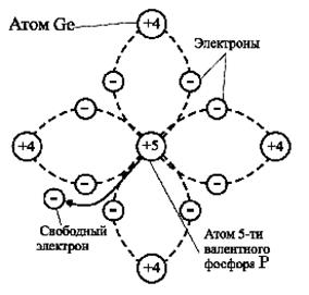 Замещение в кристаллической решётке атома германия Ge пятивалентным атомом фосфора P, способствует образованию свободного электрона, что соответствует электронной n – электропроводности. Такая электропроводность называется донорской. Атом фосфора, потеряв электрон, становится неподвижным положительным ионом.