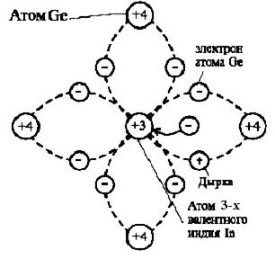 Замещение в кристаллической решетке атома германия Ge атомом трехвалентного индия In, образует ковалентную связь с тремя атомами германия. Такая связь образует дырочную p – электропроводность и называется акцепторной. Атом индия превращается в неподвижный отрицательный ион.