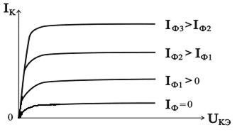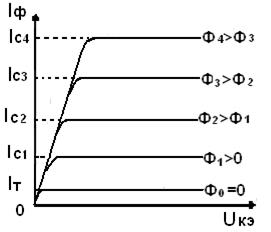 , пропорционально увеличению освещения базы. На рис.7.39 изображены вольтамперные характеристики фототранзистора