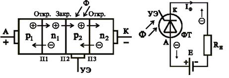 Без светового потока Ф переход П2 закрыт. При освещении через окно в области p2 происходит фотогенерация носителей зарядов электрон-дырка. Из области n1 дырки переходят в область p2 и далее через открытый переход П3 в область n2. При питании через нагрузку проходит фототок