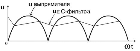 Рис.8.9. Временные диаграммы напряжений на нагрузке после двухполупериодного выпрямления и сглаживания С-фильтром